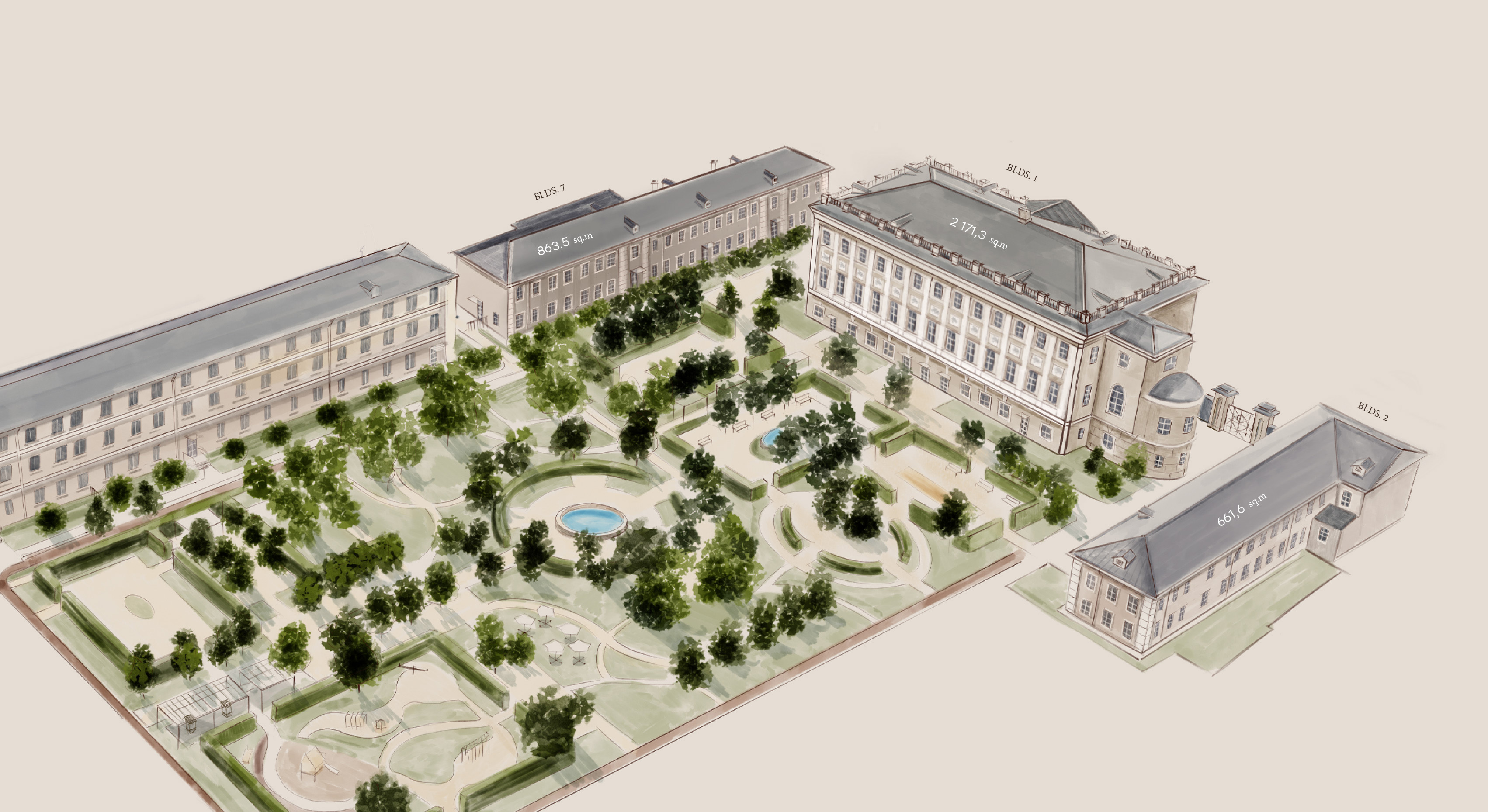 Вокруг парка в строгом порядке расположился усадебный ансамбль. В центре возвышается главный усадебный Корпус 1, а неподалёку, за лабиринтом живой изгороди, можно найти Корпус 2 и 7.