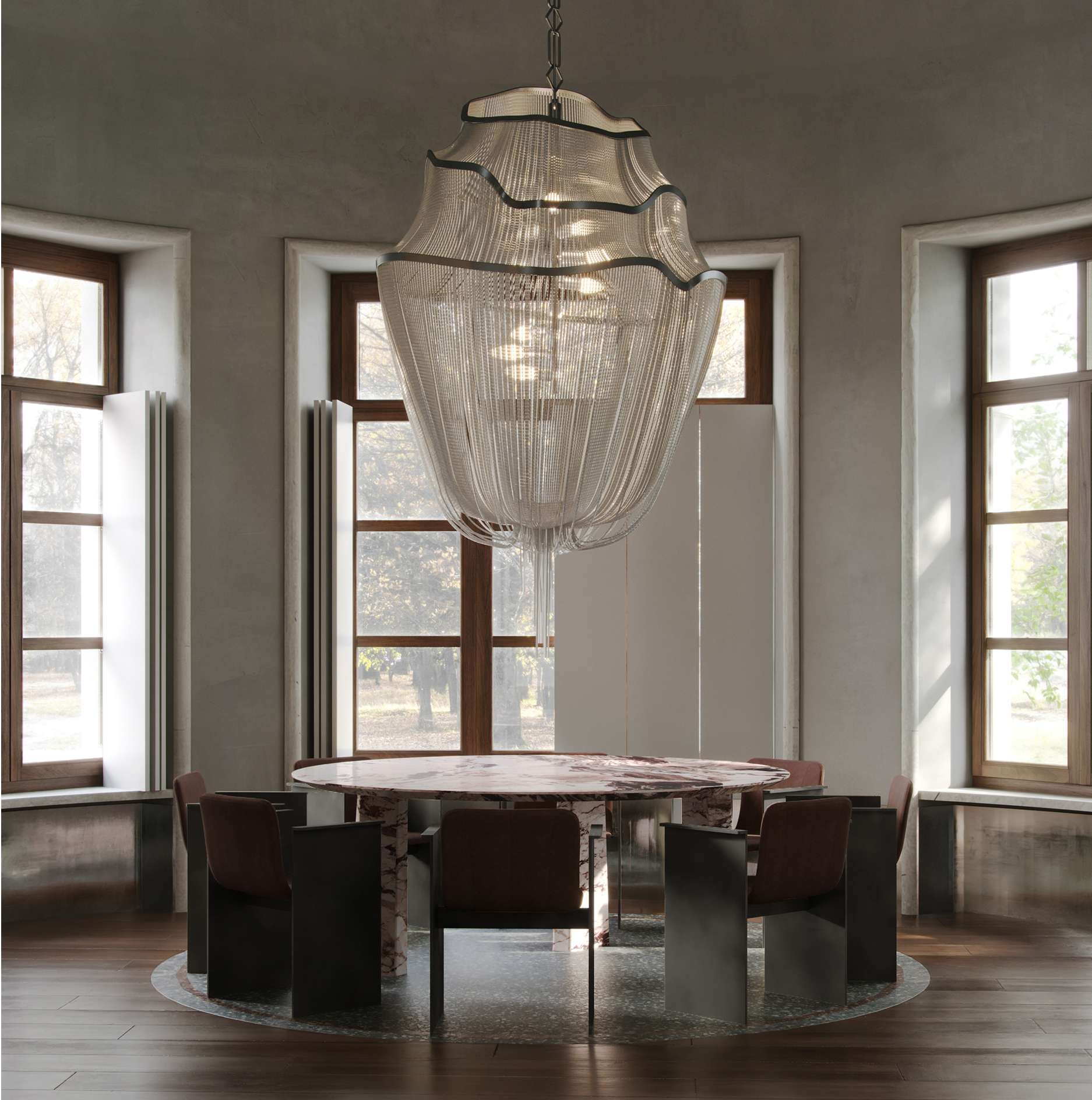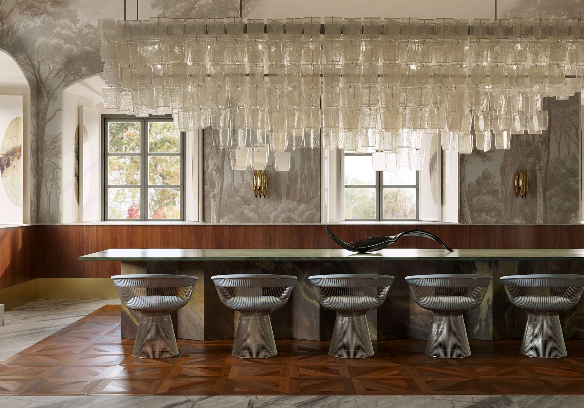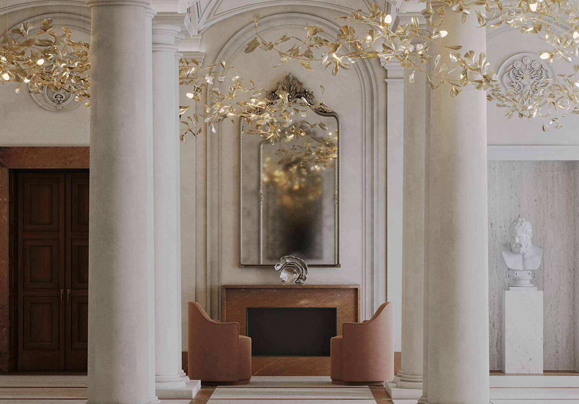 Актуальное прочтение усадебного стиля — отсюда богатство материальной палитры: мрамор, дерево, бронза, бархат, разнообразие цветовых решений и фактур, сложные световые решения, роспись гризайлью и декоративные элементы, отсылающие к классицизму.